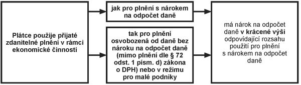 Uskutečňuje-li plátce současně jak plnění s nárokem na odpočet daně, tak plnění osvobozená od daně bez nároku na odpočet daně či plnění v režimu pro malé podniky, vyhodnocuje každé přijaté zdanitelné plnění z hlediska jeho souvislosti s uskutečněnými plněními jednotlivě. Nárok na odpočet daně v krácené výši má plátce pouze u těch přijatých plnění, která použije k oběma typům plnění, tedy jak pro plnění s nárokem na odpočet daně, tak pro plnění osvobozená od daně bez nároku na odpočet daně nebo plnění v režimu pro malé podniky. Některá přijatá zdanitelná plnění však mohou mít vazbu výhradně na uskutečňování plnění s nárokem na odpočet daně, a u těch lze uplatnit nárok na odpočet daně v plné výši. Jiná přijatá zdanitelná plnění budou mít naopak vazbu výhradně na uskutečňování plnění osvobozených od daně bez nároku na odpočet daně nebo plnění v režimu pro malé podniky, a u těch nelze nárok na odpočet daně uplatnit vůbec.
