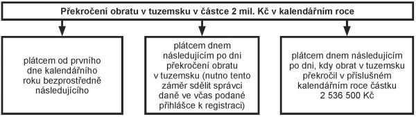 Pozn.: Do konce roku 2024 se obrat počítal klouzavě, vždy k poslednímu dni každého kalendářního měsíce za 12 bezprostředně předcházejících po sobě jdoucích kalendářních měsíců. Po překročení obratu 2 mil. Kč se osoba povinná k dani stala plátcem od prvního dne druhého měsíce následujícího po měsíci, ve kterém byl překročen obrat. Toto pravidlo bude zachováno při registracích, pokud k překročení obratu 2 mil. Kč došlo nejpozději k 31. 12. 2024.